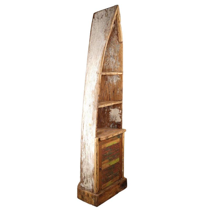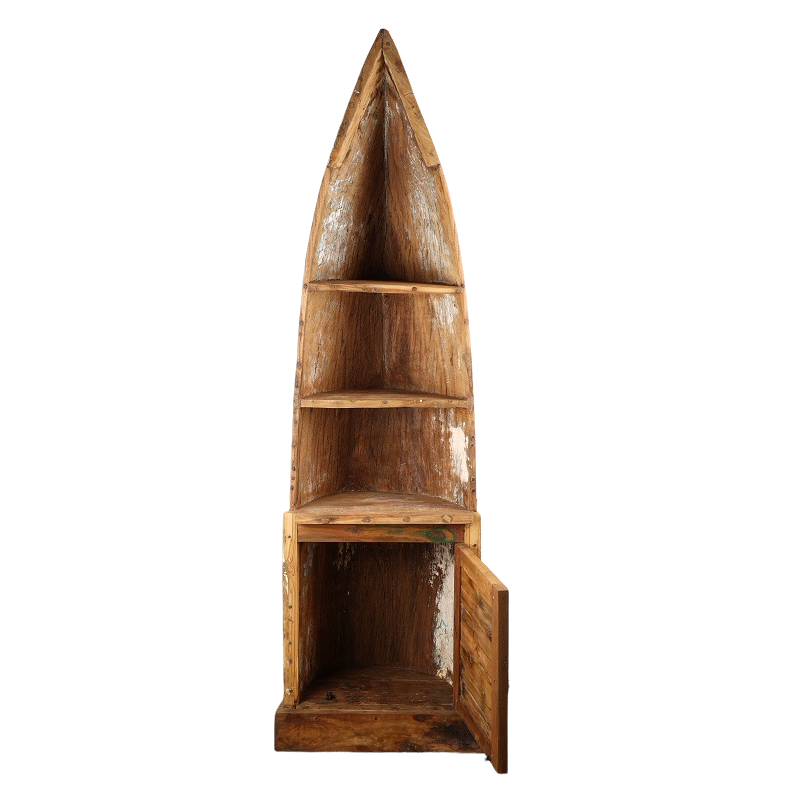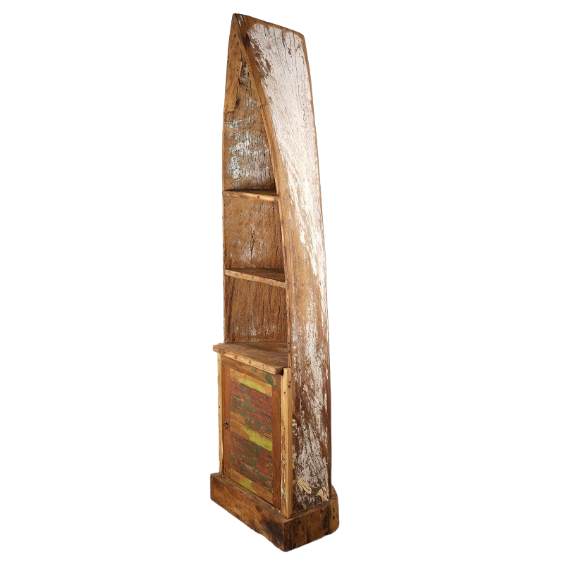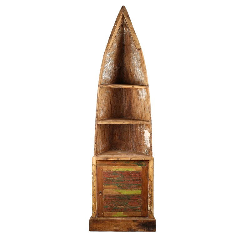 Superbe étagère en forme de bateau avec de belles nuances de couleurs et réalisée à partir de bois exotique récupéré sur de vieux bateaux indonésiens.