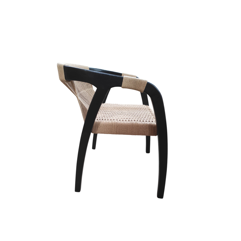 Sa structure en teck naturel, aux courbes douces et organiques, met en valeur la noblesse du bois. L’assise en corde tressée artisanalement offre un confort optimal tout en apportant une texture visuelle chaleureuse et authentique.